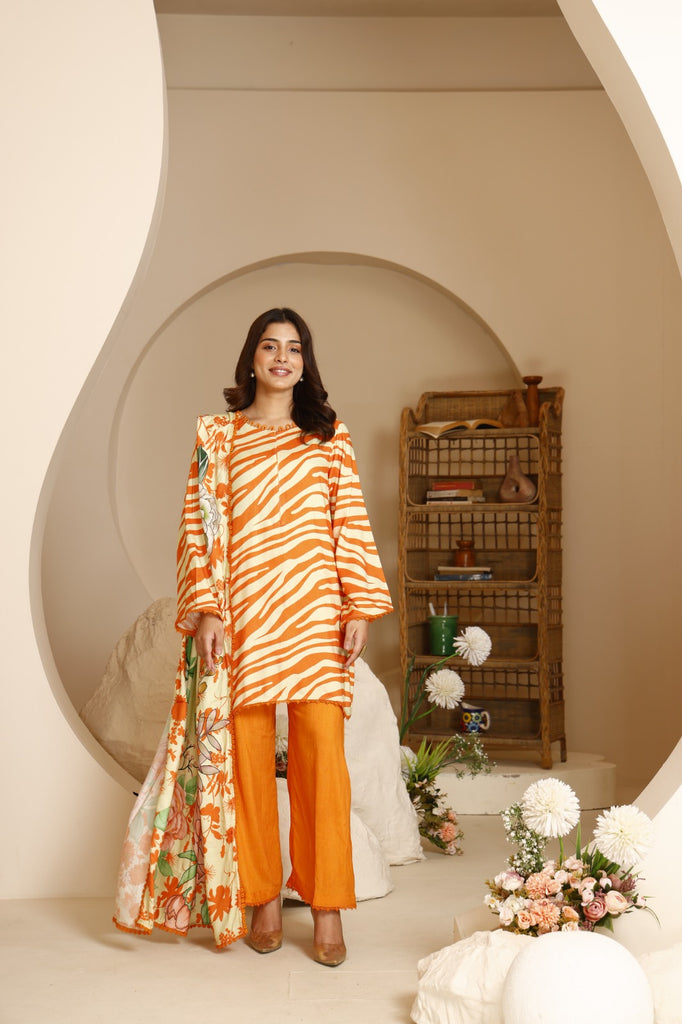 • Shirt: Striking orange and ivory zebra-pattern printed linen shirt, giving a modern and playful twist.