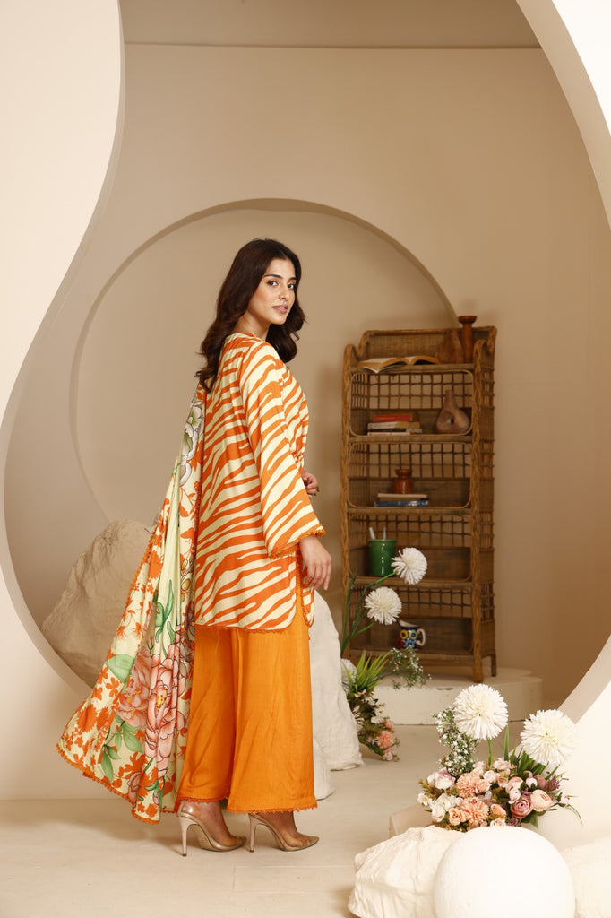 • Dupatta: Contrasting printed linen dupatta in soft cream with vibrant floral accents in orange and green, adding freshness and balance.