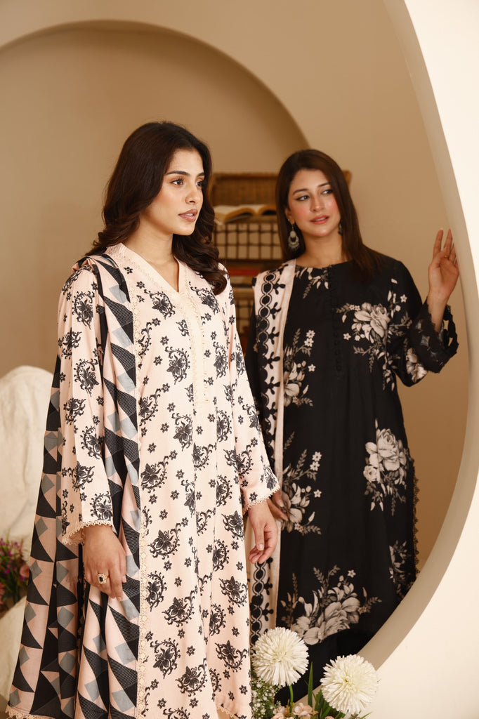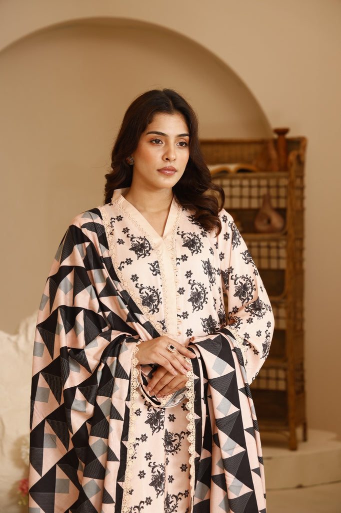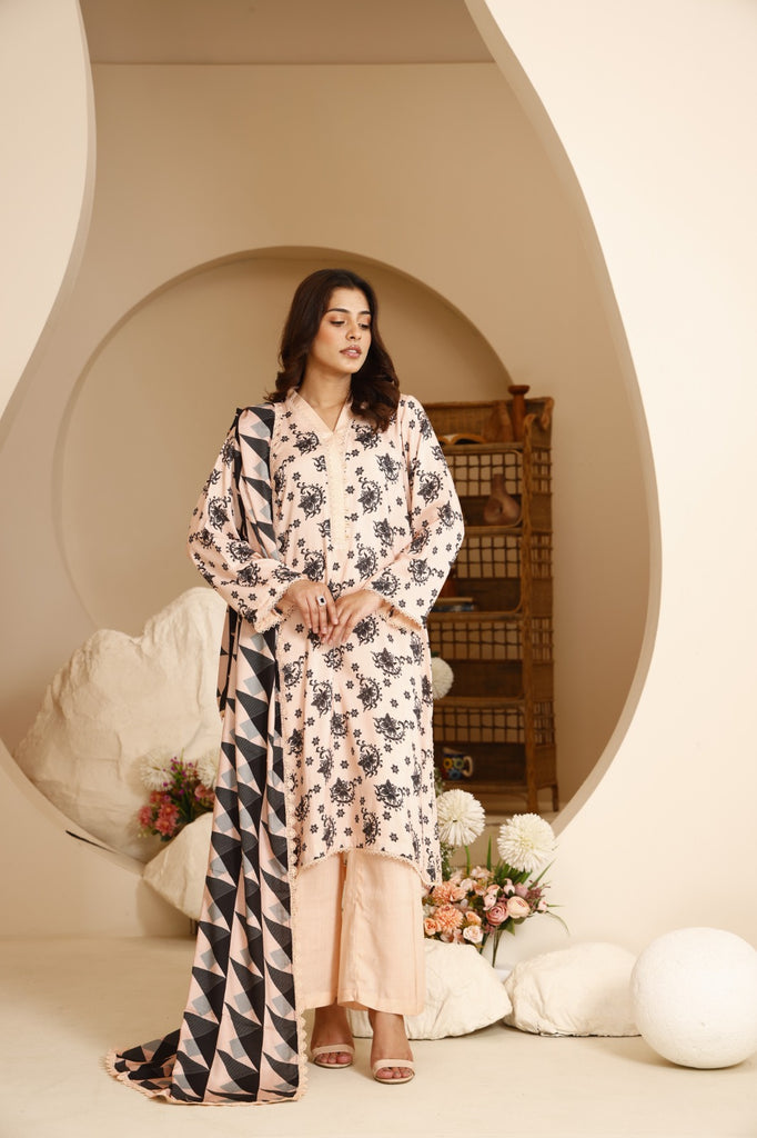 Dupatta: Stylish printed linen dupatta featuring modern geometric patterns in peach and black tones, adding a chic edge.
