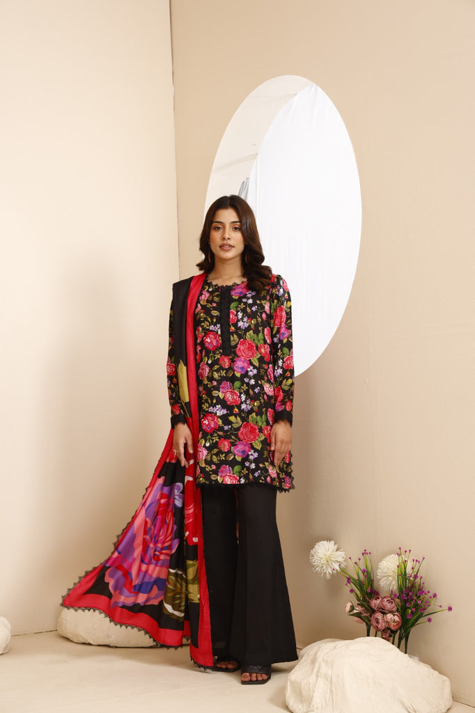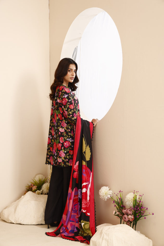 • Dupatta: Striking printed linen dupatta with oversized floral artwork in rich hues of red, purple, and green, adding drama and flair.