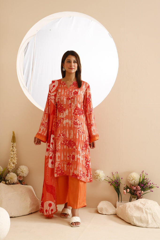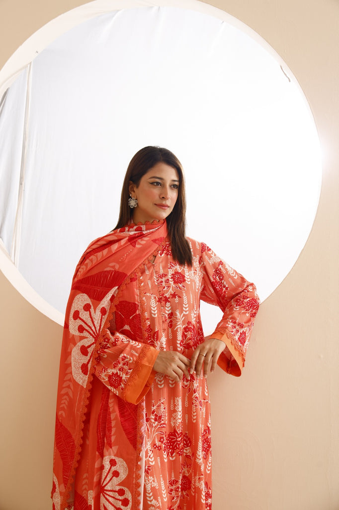 Dupatta: Coordinated printed linen dupatta in matching tones with bold floral accents, enhancing the vibrancy of the outfit.