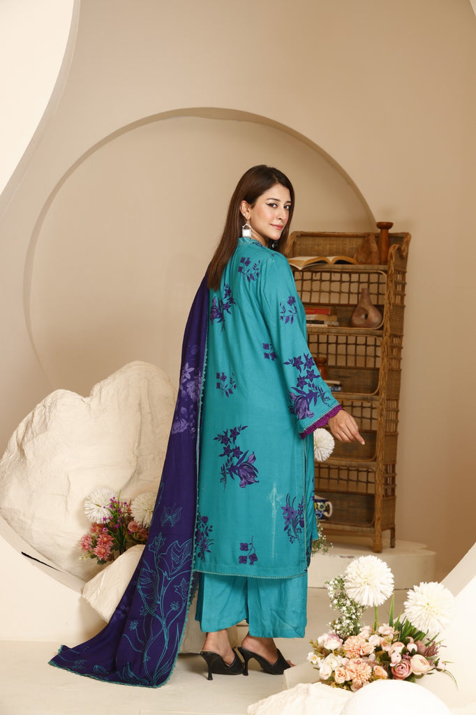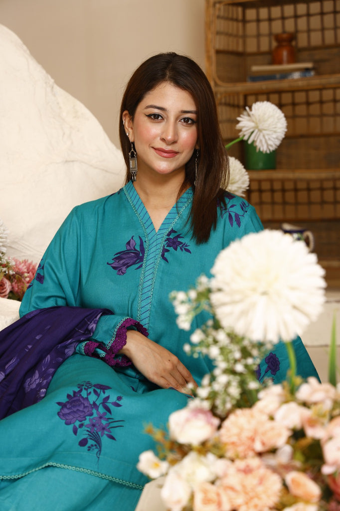 Dupatta: Contrasting deep purple printed linen dupatta with elegant floral artwork, adding richness and sophistication.